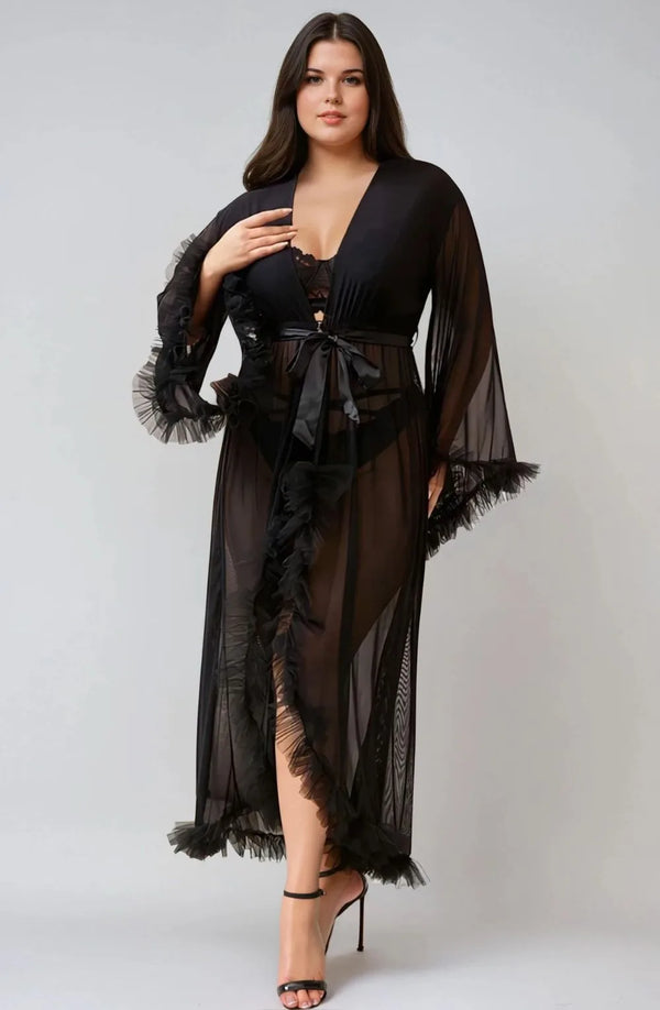 Plus Size Black Sheer Ruffle Trim Robe – Elegant Lingerie Cover-Up